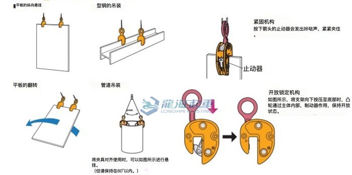 世霸SVC型豎吊鋼板鉗優(yōu)勢(shì): ●世霸SVC型豎吊鋼板鉗采用自動(dòng)緊固機(jī)構(gòu),夾緊力隨著吊上載荷的增加而增強(qiáng),設(shè)計(jì)科學(xué)合理,安全系數(shù)高 ●世霸SVC型豎吊鋼板鉗本體采用特殊合金鋼鍛造,耐久性好; ●世霸SVC型豎吊鋼板鉗設(shè)有開(kāi)放鎖定機(jī)構(gòu),利用止動(dòng)器將凸輪保持在開(kāi)放狀態(tài)。只要不拆下止動(dòng)器組件,設(shè)備就無(wú)法吊起,安全系數(shù)更高。 世霸SVC型豎吊鋼板鉗示意圖: