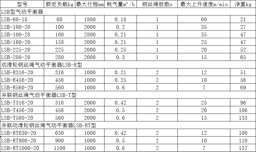LSB型氣動(dòng)平衡器優(yōu)勢(shì): ●LSB型氣動(dòng)平衡器可24小時(shí)不間斷運(yùn)行 ●LSB型氣動(dòng)平衡器采用壓縮空氣為動(dòng)力,無火花運(yùn)行 ●LSB型氣動(dòng)平衡器運(yùn)行速度快,是電動(dòng)葫蘆的2-6倍 ●LSB型氣動(dòng)平衡器有斷氣保護(hù),過載保護(hù)功能,使用更安全 ●LSB型氣動(dòng)平衡器具有無級(jí)變速功能,可根據(jù)吊起重量自由控制上升速度 ●LSB型氣動(dòng)平衡器具有自使用的“漂浮”功能,當(dāng)零部件被吊起時(shí)處于“無重力"狀態(tài),輕松實(shí)現(xiàn)精準(zhǔn)定位,實(shí)現(xiàn)助力裝配。 ●LSB型氣動(dòng)平衡器耗氣量極低,平均每個(gè)工作循環(huán)耗氣量約為0.21m/h,是氣動(dòng)葫蘆耗氣量的1/50,體積小,無噪音 ●LSB型氣動(dòng)平衡器單繩60-280kg,速度較快,懸浮距離400mm ●LSB型氣動(dòng)平衡器并聯(lián)316-560kg,雙機(jī)并聯(lián)承載力大一倍,行程不變 懸浮距離不變 ●LSB型氣動(dòng)平衡器動(dòng)滑輪316-560kg,單機(jī)雙繩承載力大一倍,行程縮小一倍,懸浮距離200mm ●LSB型氣動(dòng)平衡器動(dòng)滑輪并聯(lián)630-1100kg,雙機(jī)四繩,承載力大兩倍,行程縮小一倍,懸浮距離200mm,適合重型設(shè)備及工件搬運(yùn)安裝作業(yè) LSB型氣動(dòng)平衡器實(shí)物: